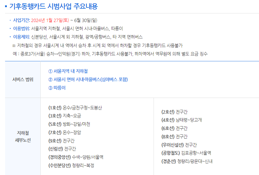24년에 정부에서 새로운 정책들을 발표하고 있습니다. 그중에 모두가 기대하는 기후동행카드에 대한 시선이 점점 커지고 있습니다. 친환경 교통혁신과 교통비 부담을 줄여주는 목적으로 출시 예정입니다. 서울에서 지하철 및 버스 등 대중교통을 무제한으로 이용할 수 있습니다. 지원대상과 신청방법 및 구매 등 자세한 내용 알아보시기 바랍니다. 추후 인천과 김포까지 확장될 예정입니다.