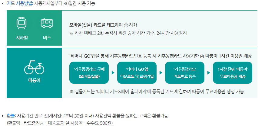 환불방법: 사용기간 만료 전 환불 하신 경우 카드 충전금에서 대중교통 실 사용액과 수수료 500원 차감 후 환불가능합니다.