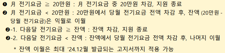 대상자 선정 발표 후 발행되는 24년 전기요금 고지서에 청구되는 전기요금부터 최대 금액 20만 원 차감 발표 후 납부해야 하는 전기요금이 20만 원 보다 적을 시 전액 차감 후, 남은 잔액은 이월 총 20만 원 차감 시 지원 종료 잔액 이월은 최대 2024년 12월 발급되는 고지서까지 적용 가능