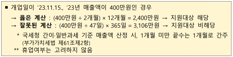 - 2023년 12월 31일 이전에 개업하고, 공고일 기준으로 폐업이 아닌 사업자만 해당됩니다. 22년 또는 23년 부가가치세 신고 매출액이 0원 초과 ~ 3,000만 원 이하인 사업자 해당합니다.