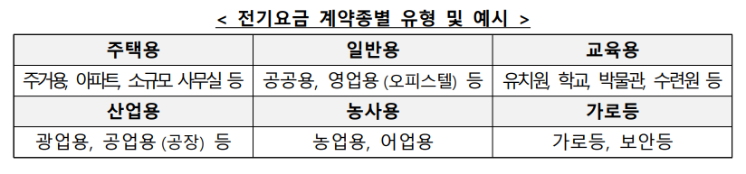 주택용, 일반용, 산업용,농사용, 교육용 등 비주거용 전기요금을 부담하는 사업자입니다.