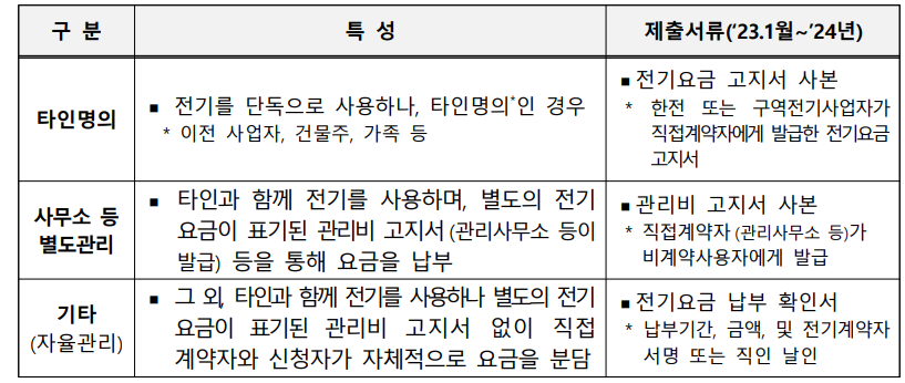 지원: 직접계약자는 대상자 선정 발표 후 전기요금 고지서부터 전기요금 차감적용 되고, 비계약사용자는 대상자 통지 후 영업일 기준으로 5일 이내 전기요금 납부 금액이 환급됩니다.