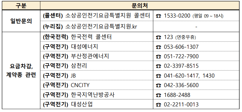 소상공인전기요금특별지원 콜센터: 1533-0200(평일 09:00 ~ 18:00)