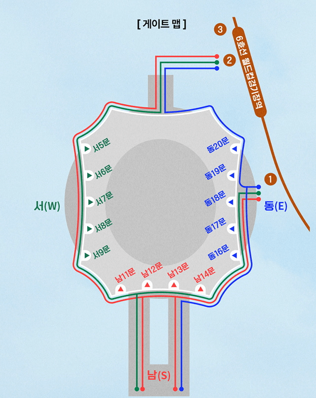 티켓은 구역에 따라 다른 색상의 온라인 티켓이 제공 됩니다. 아래 게이트 맵을 참고 하여 본인이 수령한 디지털 카드 티켓의 색상과 동일한 색상의 게이트 안내표지를 따라 이동하면 신속 정확하게 좌석을 찾을 수 있습니다.