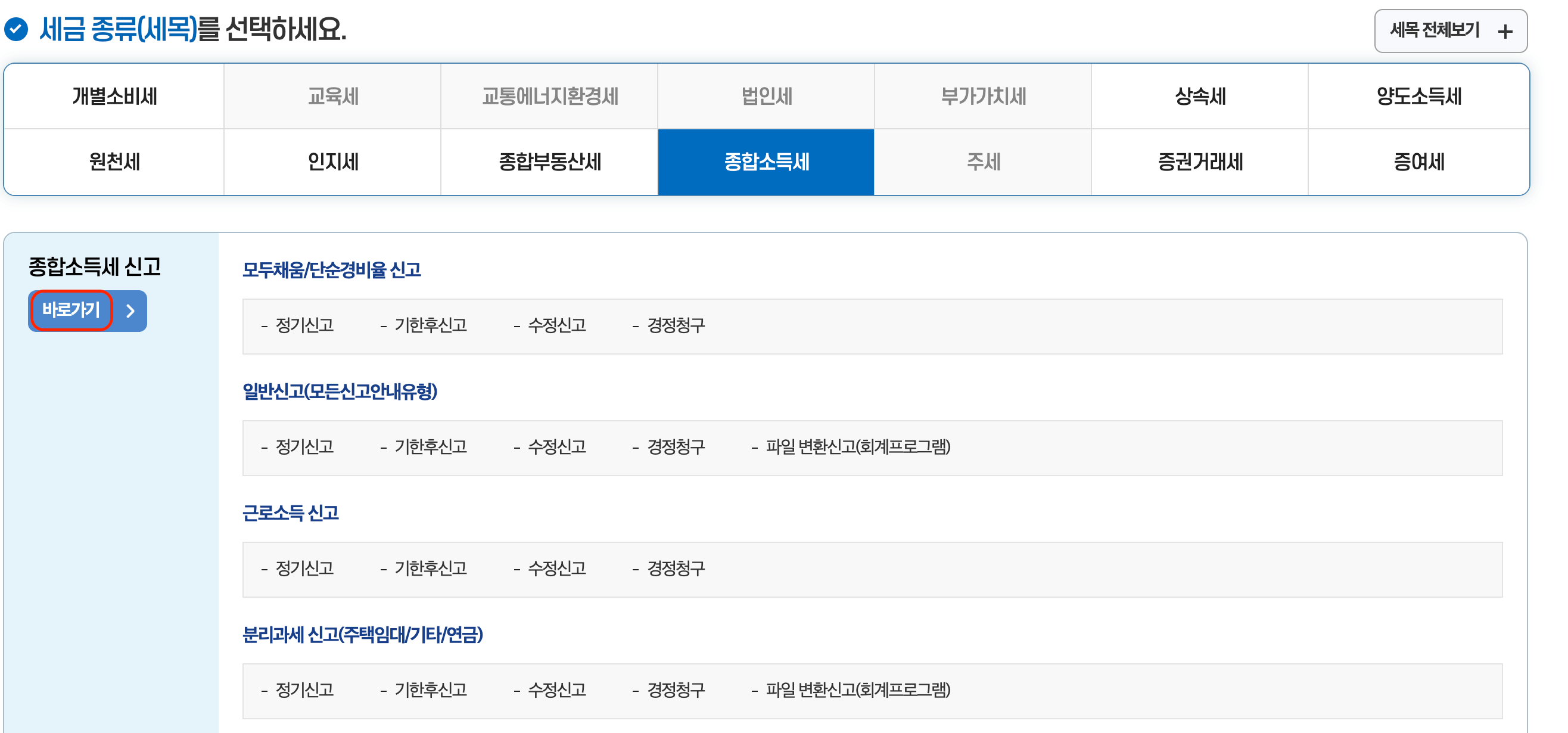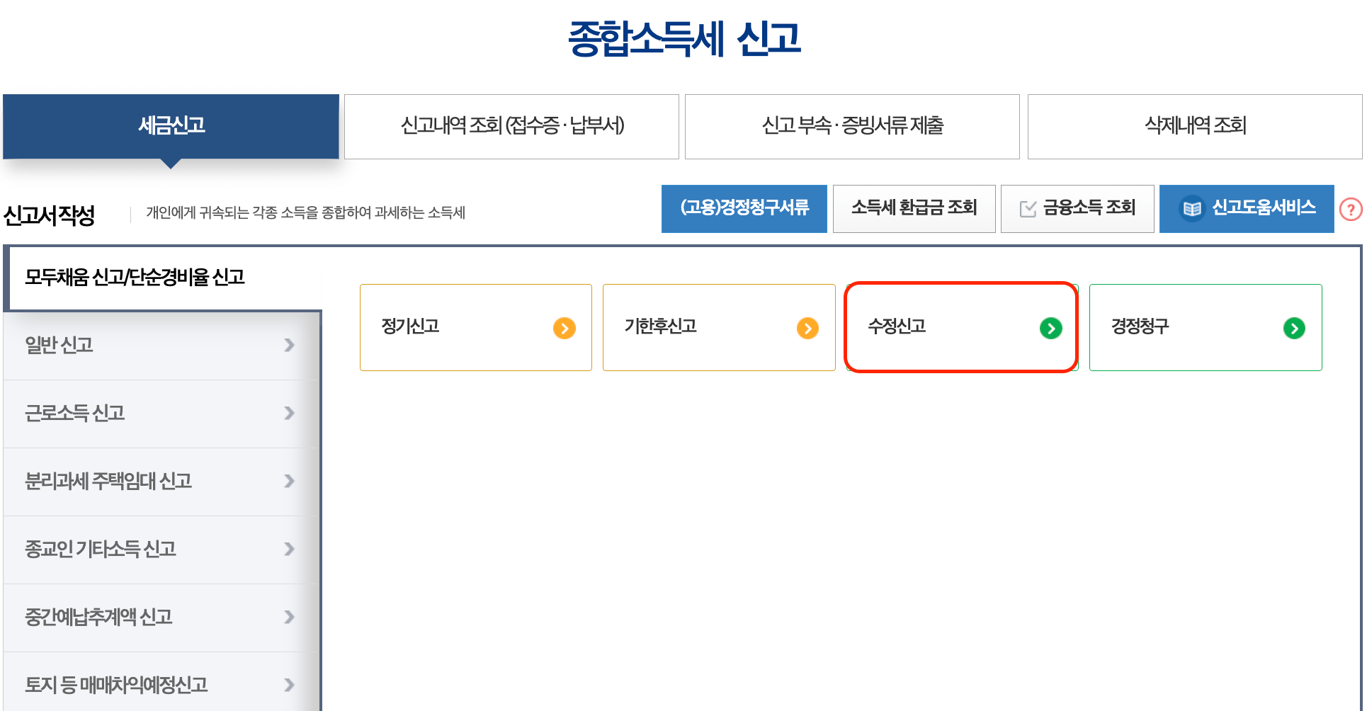 [홈택스] → [세금신고] → [종합소득세] → [바로가기] → [종합소득세 신고하기] → [정기신고] → [누락된 부분 수정]