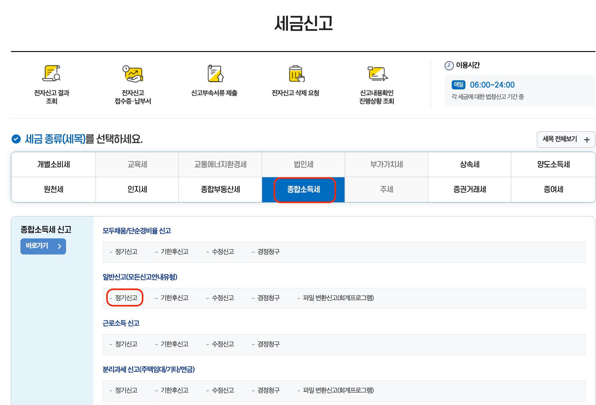 종화면이 나오면 종합소득세를 눌러주고 정기신고를 눌러 이동합니다. 이후에 나오는 화면에서 정보를 입력하고 신고하시면 됩니다.