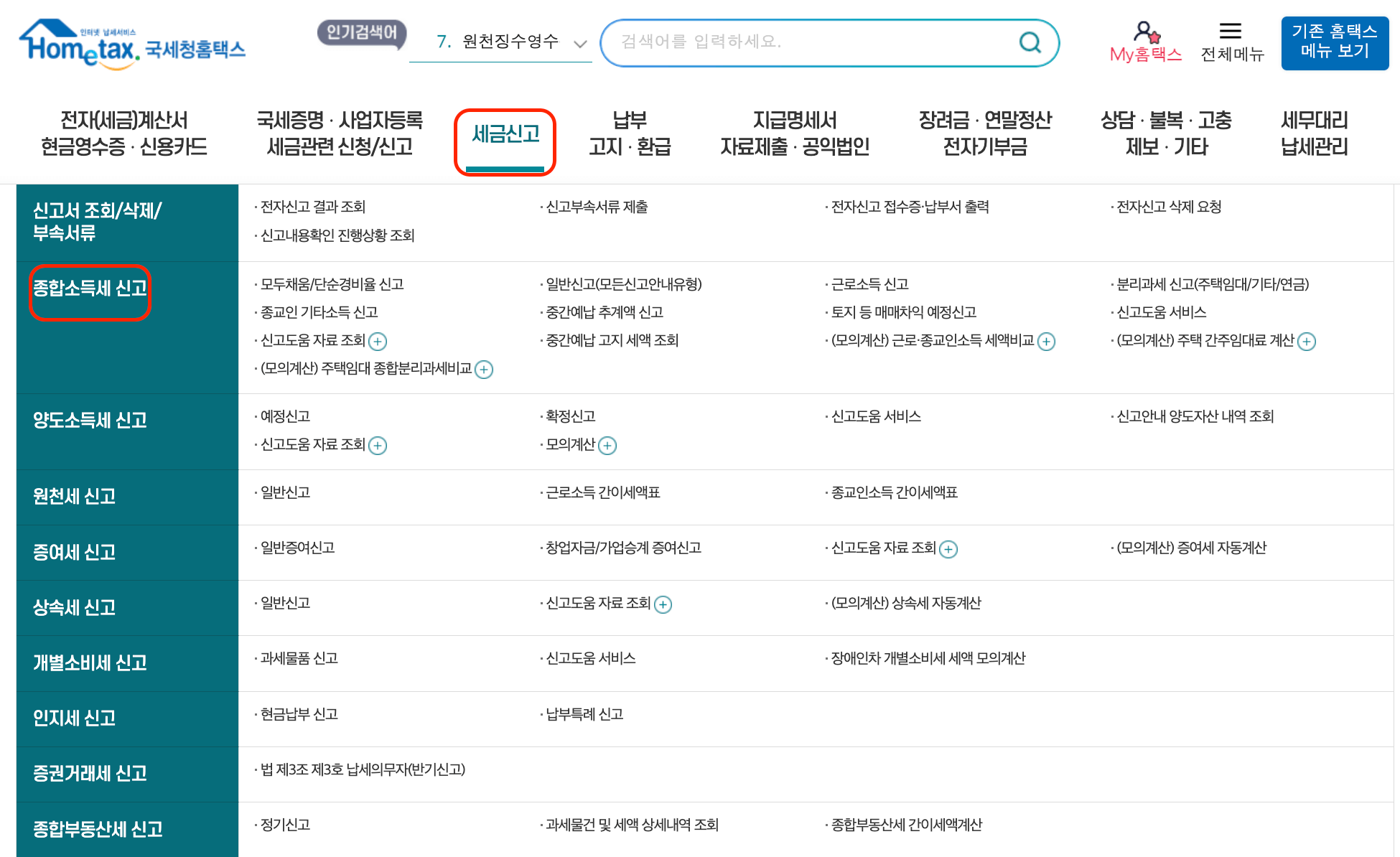 화면이 나오면 세금신고를 누르고 종합소득세 신고를 눌러줍니다.