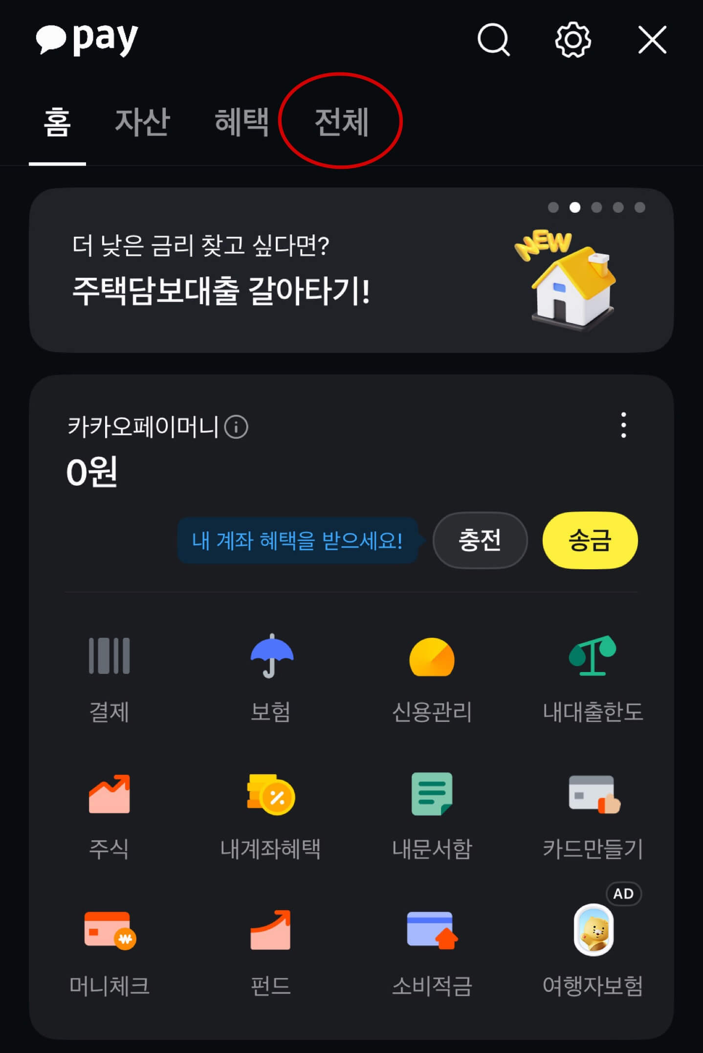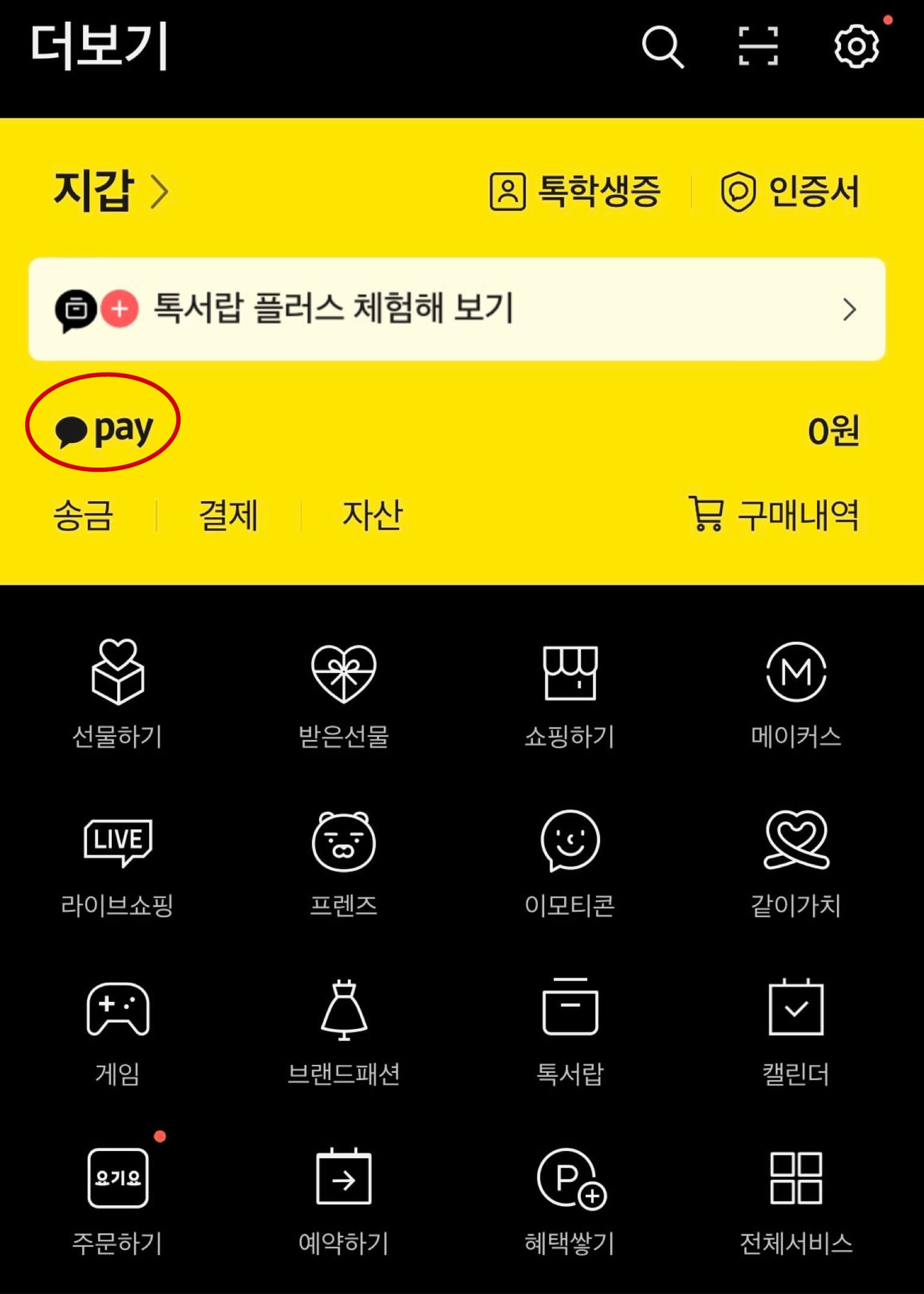 카카오톡에서 하단 오른쪽에서... 모양의 더 보기를 클릭합니다. 클릭한 후 왼쪽 상단에 카카오 페이를 눌러서 방문하여 줍니다.