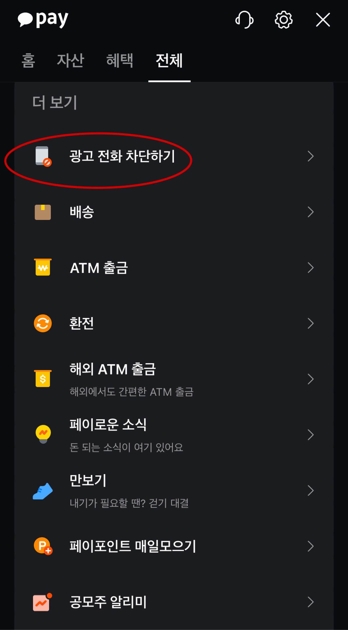 전체를 클릭 합니다. 전체에 들어간 후 광고 전화 차단하기에 들어갑니다. 들어간 후 노란색의 광고 전화 차단하기를 클릭해 줍니다. 동의를 진행한 후 핸드폰으로 전송된 인증번호 6자리를 눌러 입력해 줍니다.