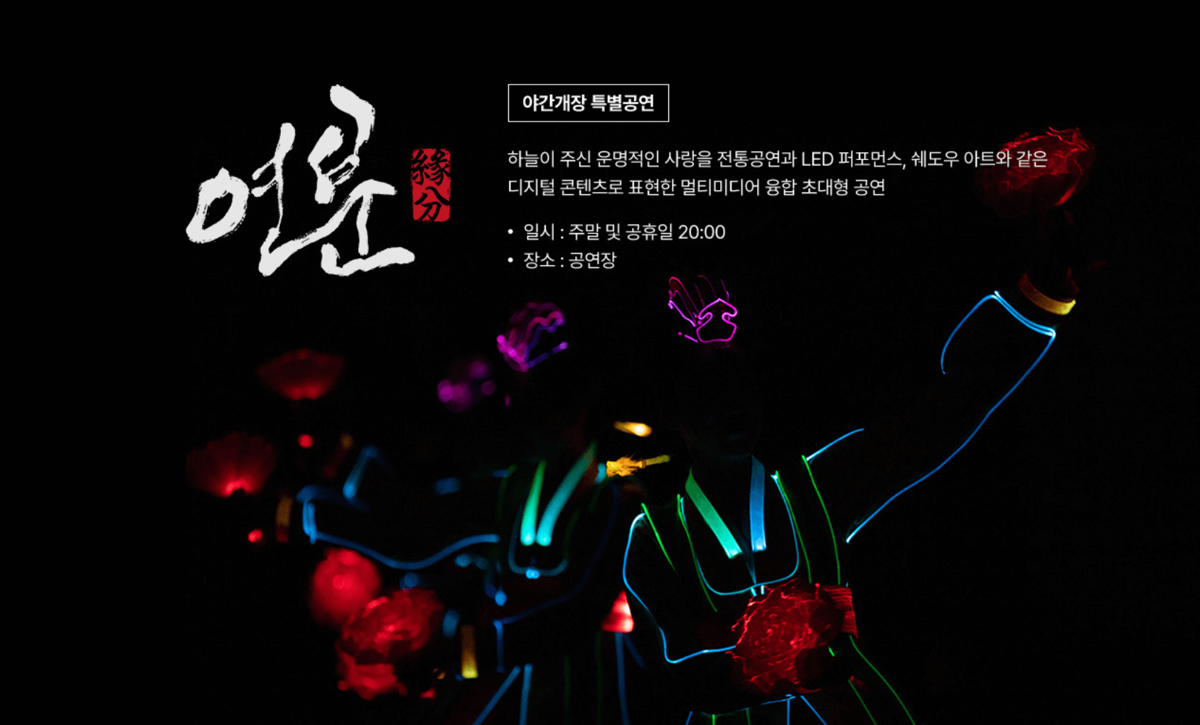 연분은 야간개장 특별공연으로 기획된 화려한 퍼포먼스를 보여주는 공연으로 금, 토, 일, 공휴일 오후 8시에 공연합니다. 하늘이 내린 운명적인 사랑을 디지털 콘텐츠(그림자 예술, 전통공연, LED 퍼포먼스)로 표현하기에 풍성한 내용과 귀에 쏙 들어오는 사운드를 즐기시기 바랍니다.
