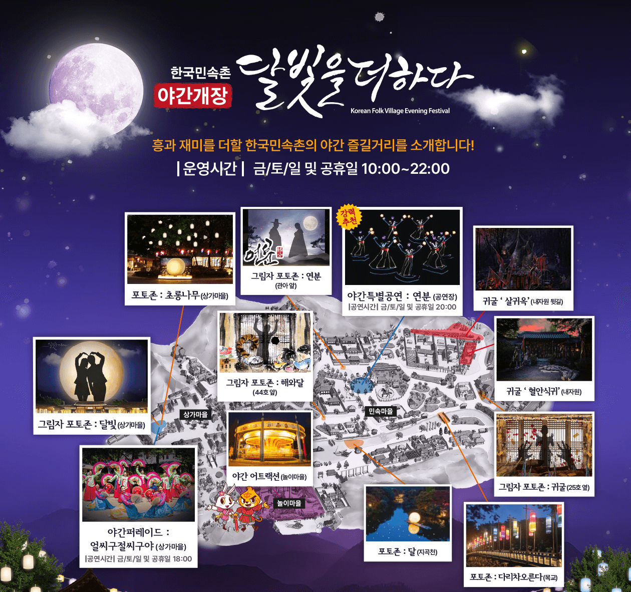 한국민속촌은 다양한 체험뿐 아니라 방문하시는 분들을 위한 다양한 포토존을 만들었습니다. 야간개장 '달빛을 더하다'라는 콘셉트에 어울리는 콘셉트가 많으니 예쁜 사진으로 좋은 추억하시기 바랍니다.