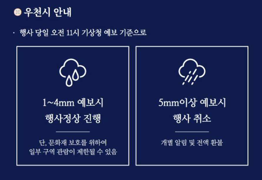 행사 당일 오전 11시 기준으로 기상청에서 예보된 우천 기준이 1 ~ 4mm 인 경우는 정상 운영합니다. 예외인 경우는 5mm 이상 우천이 예보로 인하여 행사가 취소 된 경우 개별 알림과 함께 전액 환불해 드립니다.