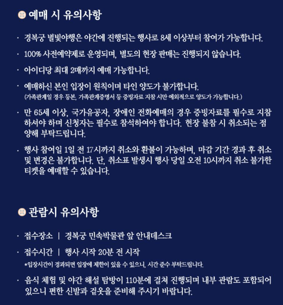 ❗️ 현장에서 증빙서류(장애인 복지카드, 국가유공자증 등) 지참하지 못한 경우, 할인기준과 다른 경우 별빛야행의 참가가 취소되며, 별도의 환불이 불가능함을 알려드립니다.